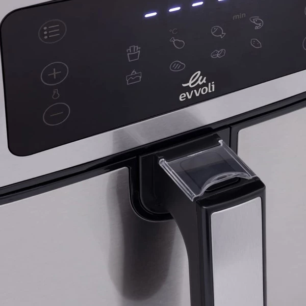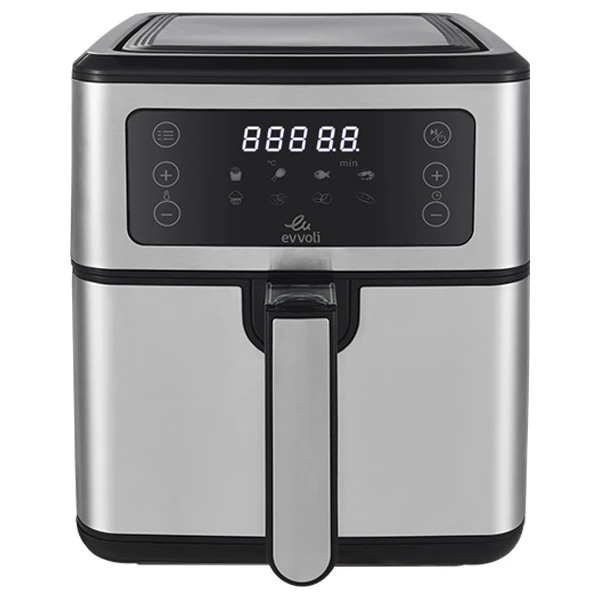 سرخ کن هوشمند بدون روغن ایوولی مدل EVKA-AF5508D از سری تولیدات جدید شرکت ایوولی با طراحی و مهندسی شده ایتالیا و ساخت چین میباشد. این محصول با دارا بودن ظرفیت ۵٫۵ لیتر از سرخکن های نسبتا سایز بزرگ بازار بوده که با توان ۱۷۰۰ وات به راحتی از پخت و سرخ کردن تمامی مواد غذایی بر می آید. صفحه کنترل این محصول تمام لمسی بوده که علاوه بر تنظیم دستی زمان و میزان حرارت ،امکان شروع ۸ برنامه پخت پیش فرض مانند یخ زدایی ،سیب زمینی ،مرغ،ماهی ،نان ،کیک ،میگو و… را دارا میباشد. سبد و بدنه این محصول از نوع استیل ضد زنگ بوده که طول عمر محصول را افزایش میدهد.