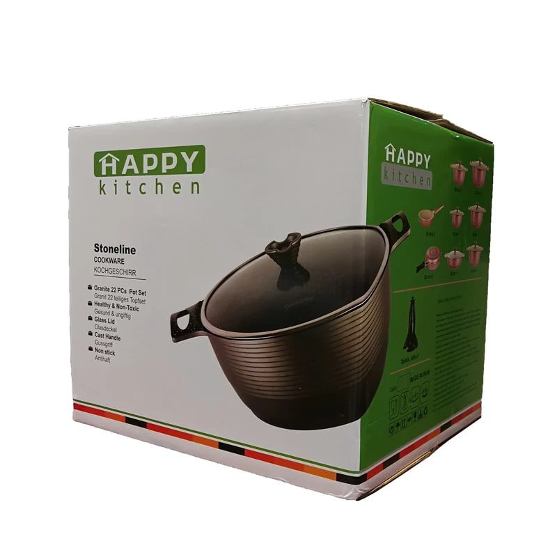 سرویس قابلمه هپی کیچن با طراحی ظریف و محاسبه شده زیبایی آشپزخانه و لذت شما از آشپزی کردن را دوچندان می کند.هر یک از قابلمه ها و ماهیتابه های این سرویس دارای بسته بندی جداگانه و شکیلی هستند که این امکان را برای شما فراهم می کند تا به صورت تکی بتوانید آن ها را هدیه دهید.وزن سبک هر یک از قابلمه ها و یا ماهیتابه ها باعث راحت تر شدن شستشوی این ظروف می شود. این سرویس شامل یک عدد ماهیتابه دو دسته با در و یک عدد ماهیتابه ی تک دسته و پنج عدد قابلمه در ابعاد مختلف و یک عدد کفگیر و یک عدد ملاقه میباشد.