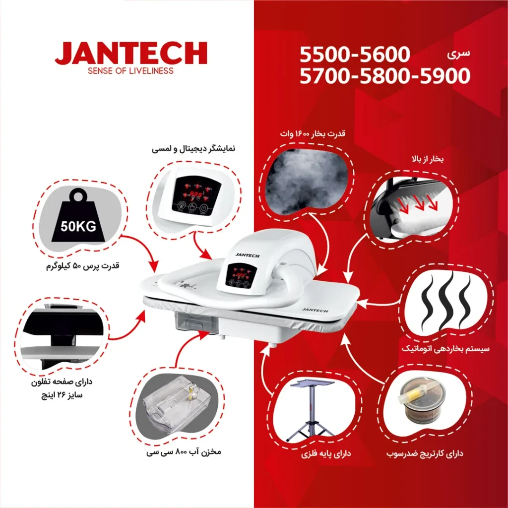نکته مهم دیگر اینکه سری ۵۵۰۰ تا ۵۹۰۰ اتو پرسهای جانتک از نظر مشخصات فنی کاملاً مشابه هستند و تفاوت آنها فقط در رنگ دستگاه است؛ بنابراین میتوانید بر اساس سلیقه ظاهری، مدل مناسب خود را انتخاب کنید.