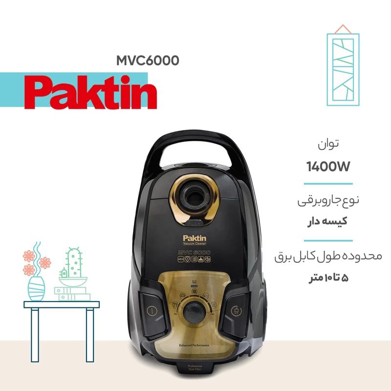 جاروبرقی پاکتین مدل بیصدا MVC 6000 جدیدترین محصول پاکتین از نوع موشکی یا خوابیده بوده و با افتخار مجهز به موتور دومول میباشد. این موتور توسط بزرگترین کارخانه تولیدکننده موتور جاروبرقی در اروپا و محصول کشور اسلوونی است و با ضمانت تعویض ۵ ساله عرضه می گردد.این موتور پر بازده با کلاس مصرف برق A، و فقط با ۱۴۰۰ وات مصرف انرژی توانایی مکش بسیار مناسبی ایجاد می کند به طوریکه تولید کننده توصیه میکند برای محافظت از فرش ها و جلوگیری از کنده شدن پرز قالی از حداکثر توان آن فقط روی سطوح سخت یا موکت استفاده کنید.همچنین جاروبرقی پاکتین مدل بیصدا MVC 6000 مجهز به تکنولوژی راه اندازی نرم موتور یا به اصطلاح انگلیسی سافت استارت (Soft Start) است. این سیستم علاوه بر ایجاد صدای کم لحظه روشن شدن و خاموش شدن موتور باعث طولانی تر شدن عمر موتورهای جاروبرقی می شود.