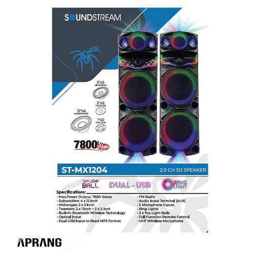 خش‌کننده خانگی ساند استریم مدل ST-mx1204 یکی از سیستم‌های صوتی با کیفیت بالا و طراحی جذاب است که برای افرادی که به دنبال یک تجربه صوتی بی‌نظیر هستند، انتخابی مناسب می‌باشد. این پخش‌کننده با قدرت خروجی ۷۸۰۰ وات PMPO و طراحی حرفه‌ای خود، قابلیت پخش موسیقی با وضوح و شفافیت بالا را فراهم می‌کند. در ادامه، به بررسی ویژگی‌ها و مشخصات این دستگاه پرداخته می‌شود: